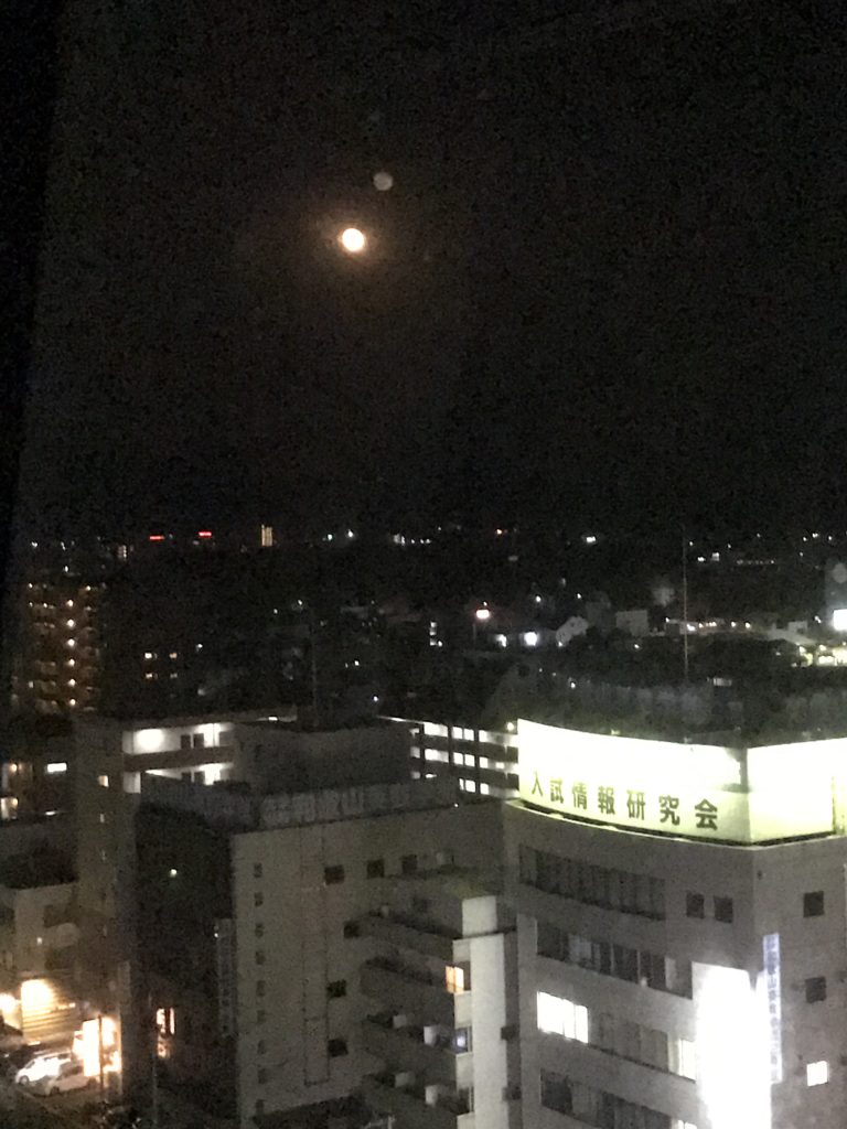 旅日記宿泊先のホテルに帰ってきたら、窓からみえたよ!そう、大きなピンクの月❣️とでも綺麗で、ほんとこんなに眺めのいいお部屋に泊まれてラッキーでした。
