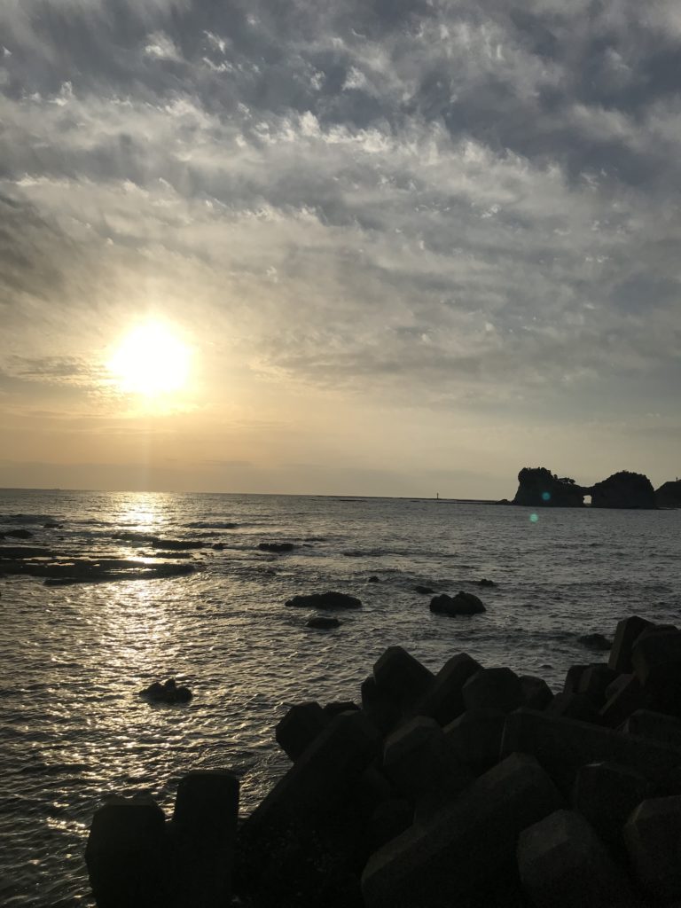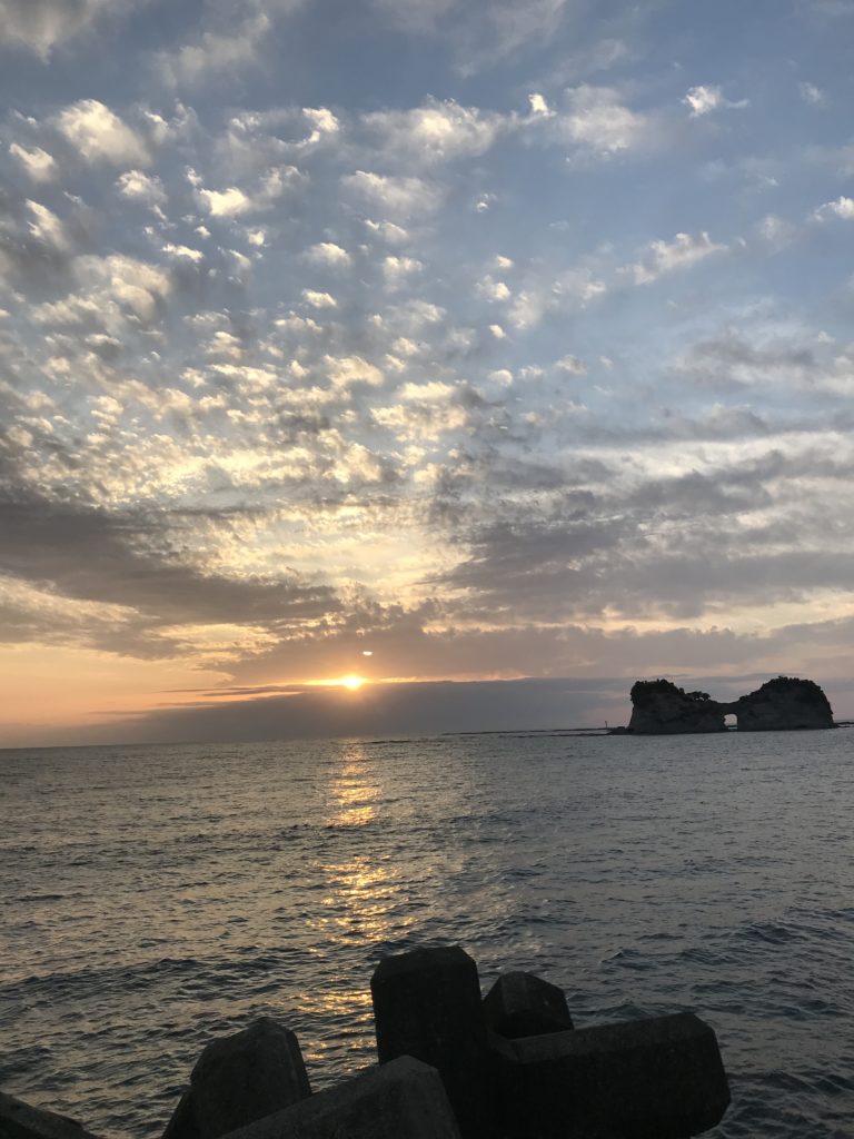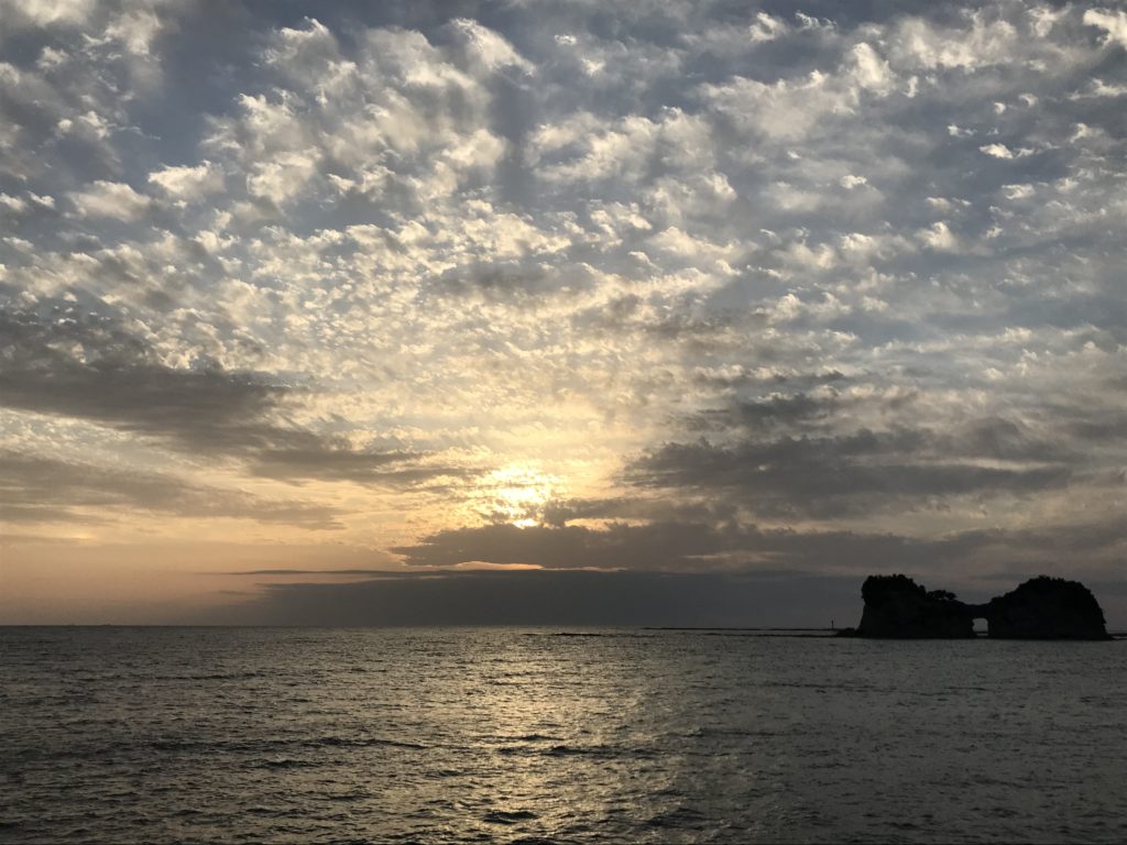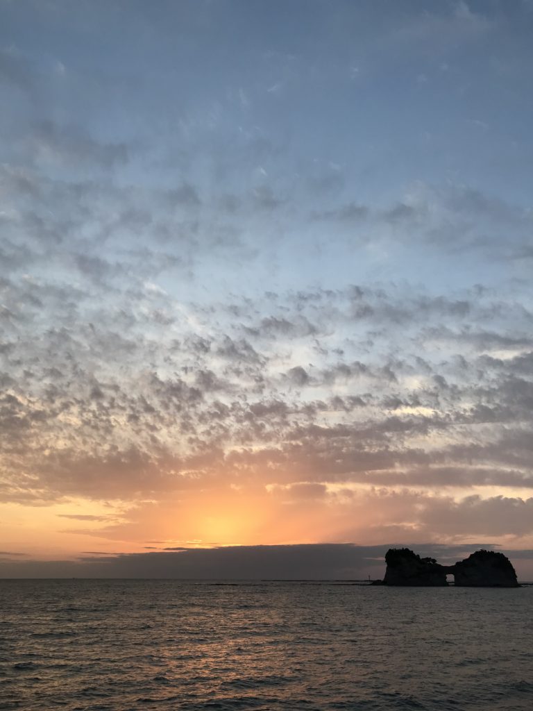 円月島の夕日は、岩の穴に太陽が入るのが見えるみたいです。が、私が行った時は、曇っていて、海に沈む夕日は見れませんでした。