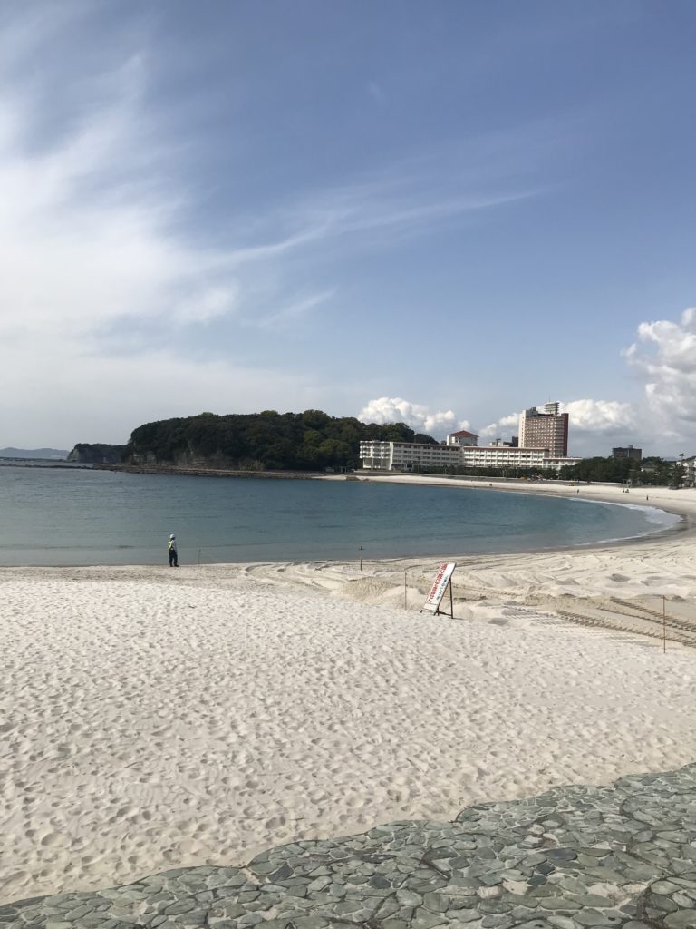 この白浜のビーチ。まず、名前の通り白くてキメが細かい砂できれい。歩いてると、まるで積もりたての雪の上を歩くようなキュッキュッという感覚。